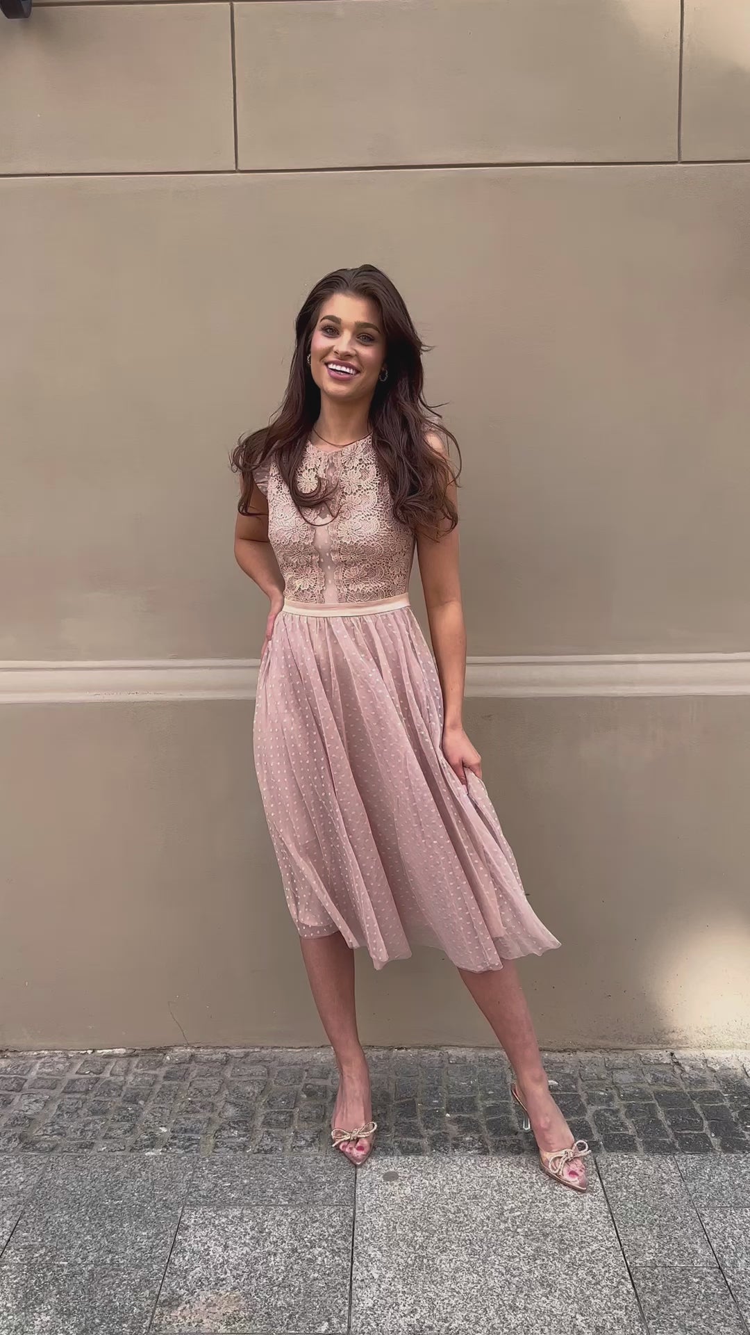 Elegancka i stylowa, beżowa sukienka midi Nude wykonana z tiulu i koronki jest doskonałym wyborem na specjalne wydarzenia. Z dbałością o szczegóły, posiada koronkową górę oraz delikatnie rozkloszowany dół z tiulu, ozdobiony dyskretnymi kropkami. Ta sukienka to idealne połączenie klasy i subtelności, podkreślające naturalne piękno.